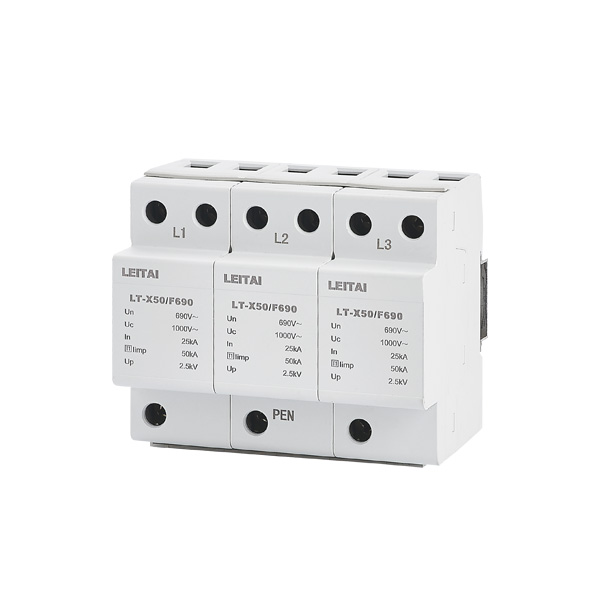 LT-F系列浪涌保护器专用于风能发电系统风机侧,当系统因雷击或者其他原因出现过电压时,电涌保护器立即在纳秒级时间内迅速导通,将过电压引入大地卸放,从而保护风机设备。